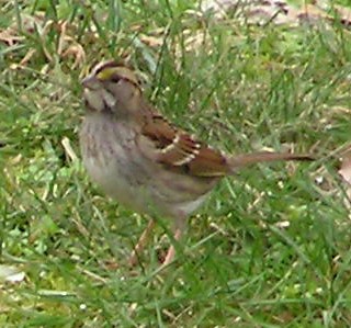 Notes: The distinctive white pattern on the throat is very diagnostic; as is the yellow lore (between bill and eye). There are two morphs (white and tan) referring to the color of the stripes on the head. Breeding pairs seem always to consist of one of each morph. These sparrows winter in the south